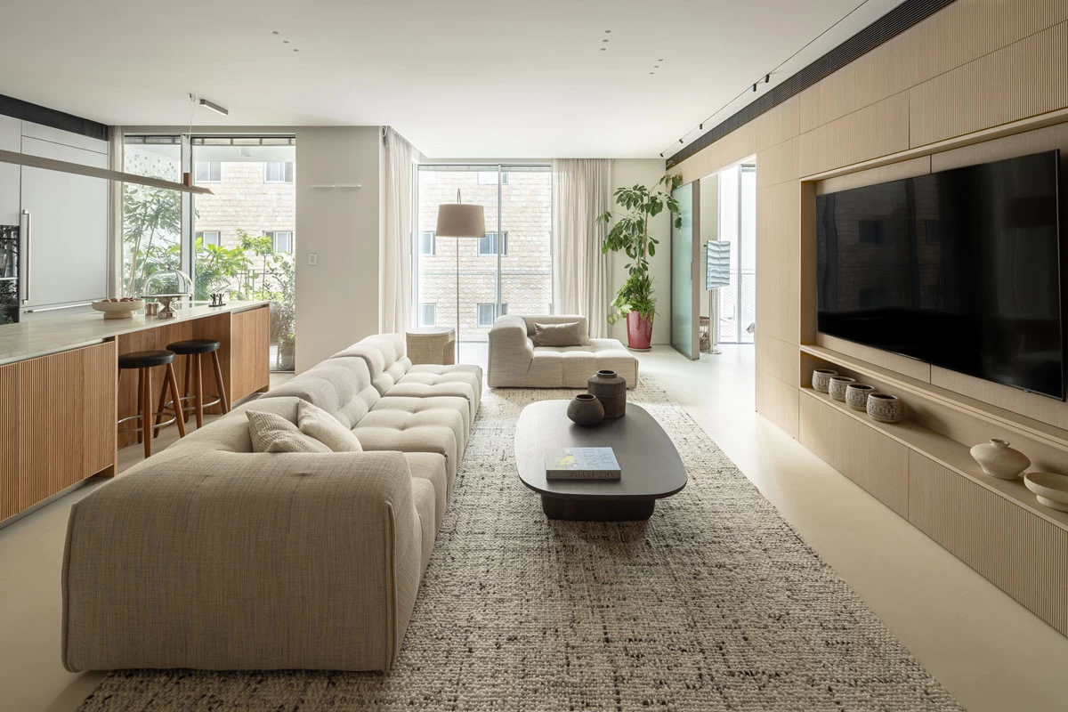 צילום מיטה זוגית בדירה עם עבודת נגרות בסלון עם ספה