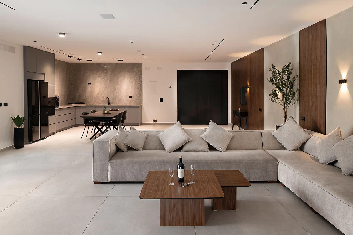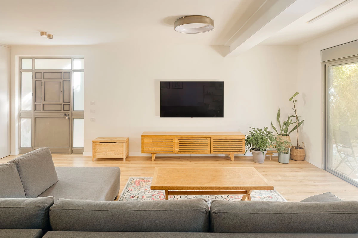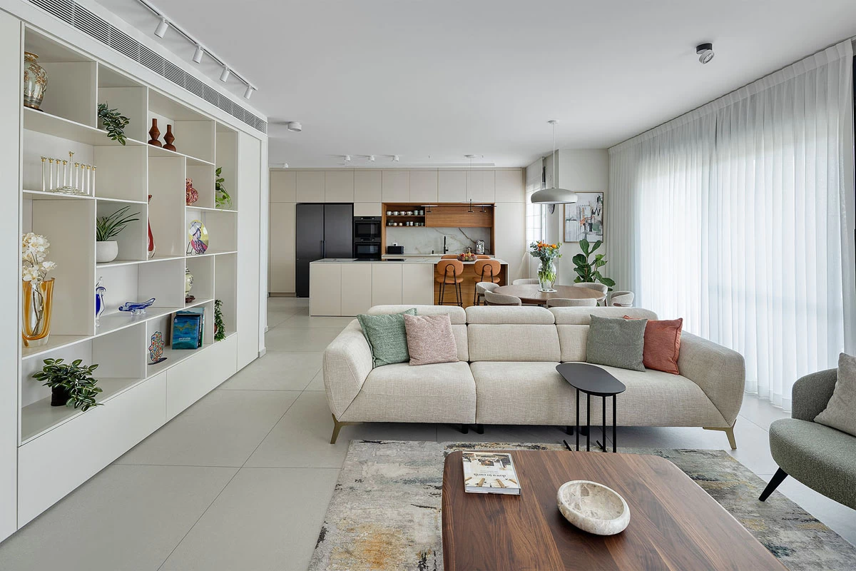 צילום מיטה זוגית בדירה עם עבודת נגרות בסלון עם ספה
