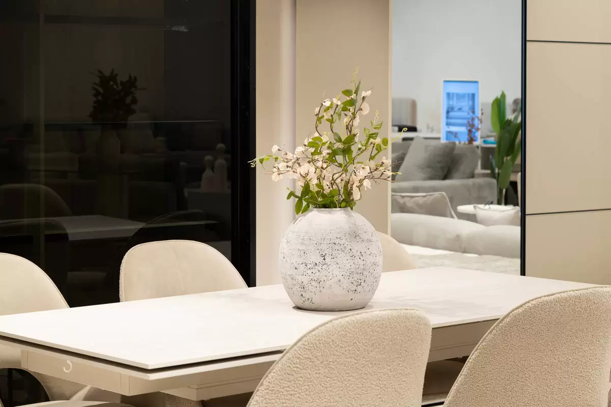 צילום שולחן עם כד פרחים מלאכותיים לקישוט